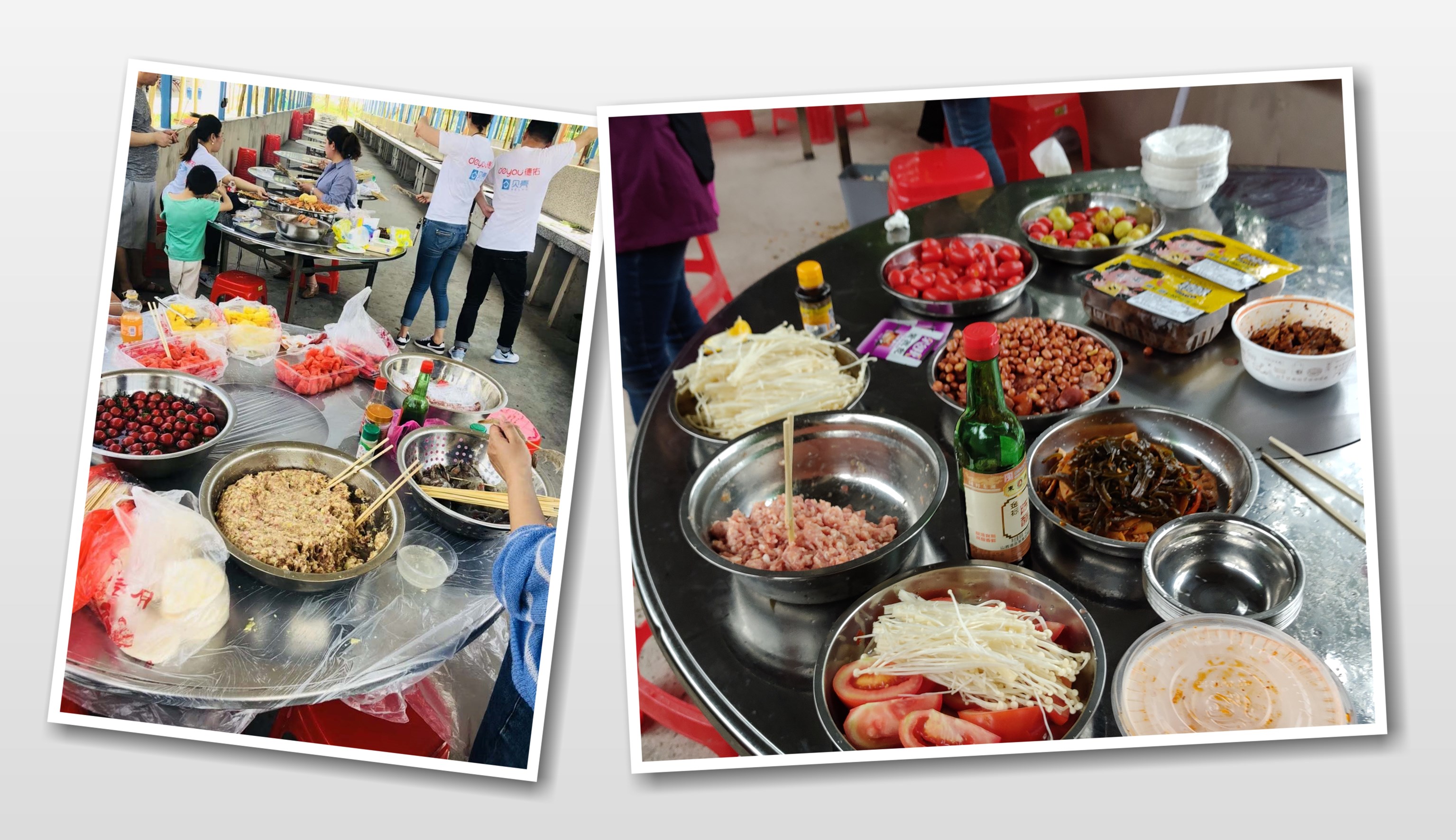 游戏玩完了就是我们的午饭时间了。大家可以选择不同的用餐方式。比较受大家欢迎的就是野炊。体验自己抓鸡捉鱼的乐趣。大家自己分工分角色做好了一桌丰盛的地道无公害农家菜了。看着好馋啊。看来大家的厨艺真的是很OK的。