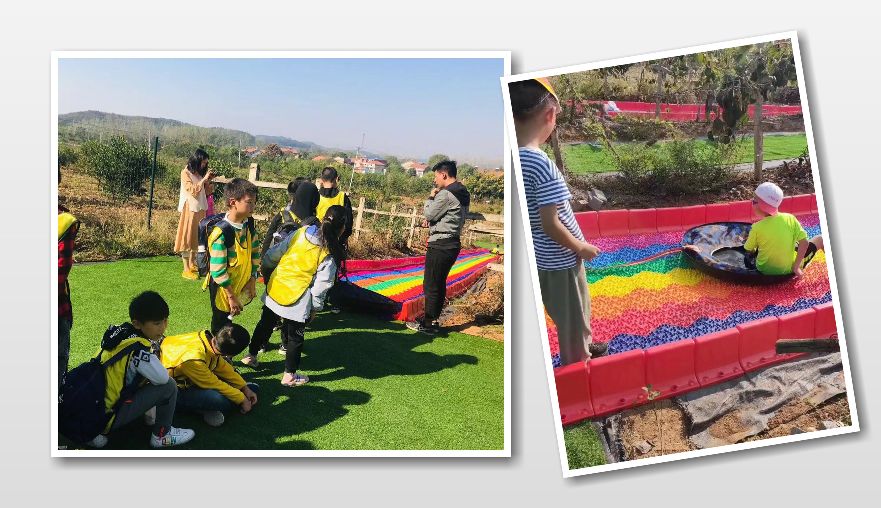 进门大家就被彩虹滑道吸引住了,绚丽颜色的滑道确实很吸睛。在滑道旁还种了猕猴桃,从滑道上往下话还能看到已经开始长的猕猴桃,是不是很惊奇。不管是大人还是小孩都是在这里驻足不愿走呢。一次两次还想试一试。