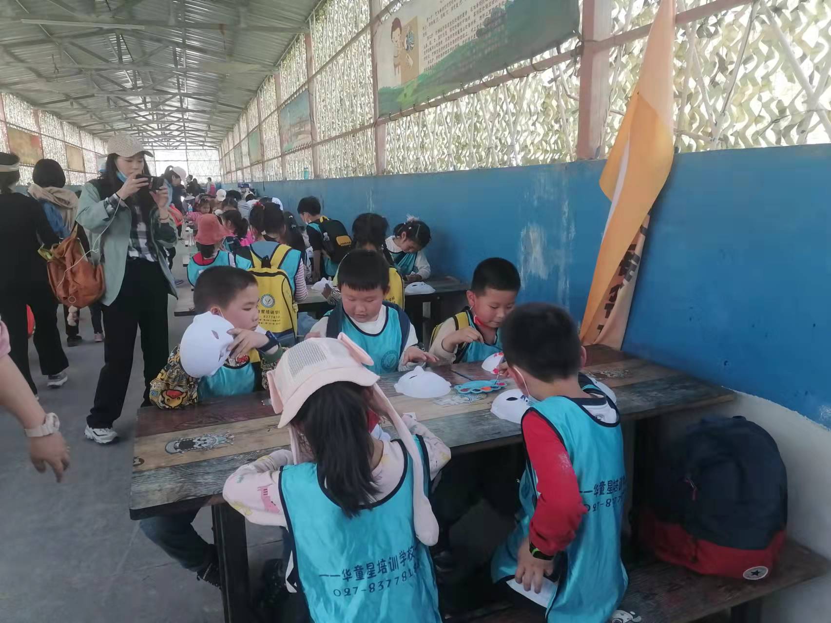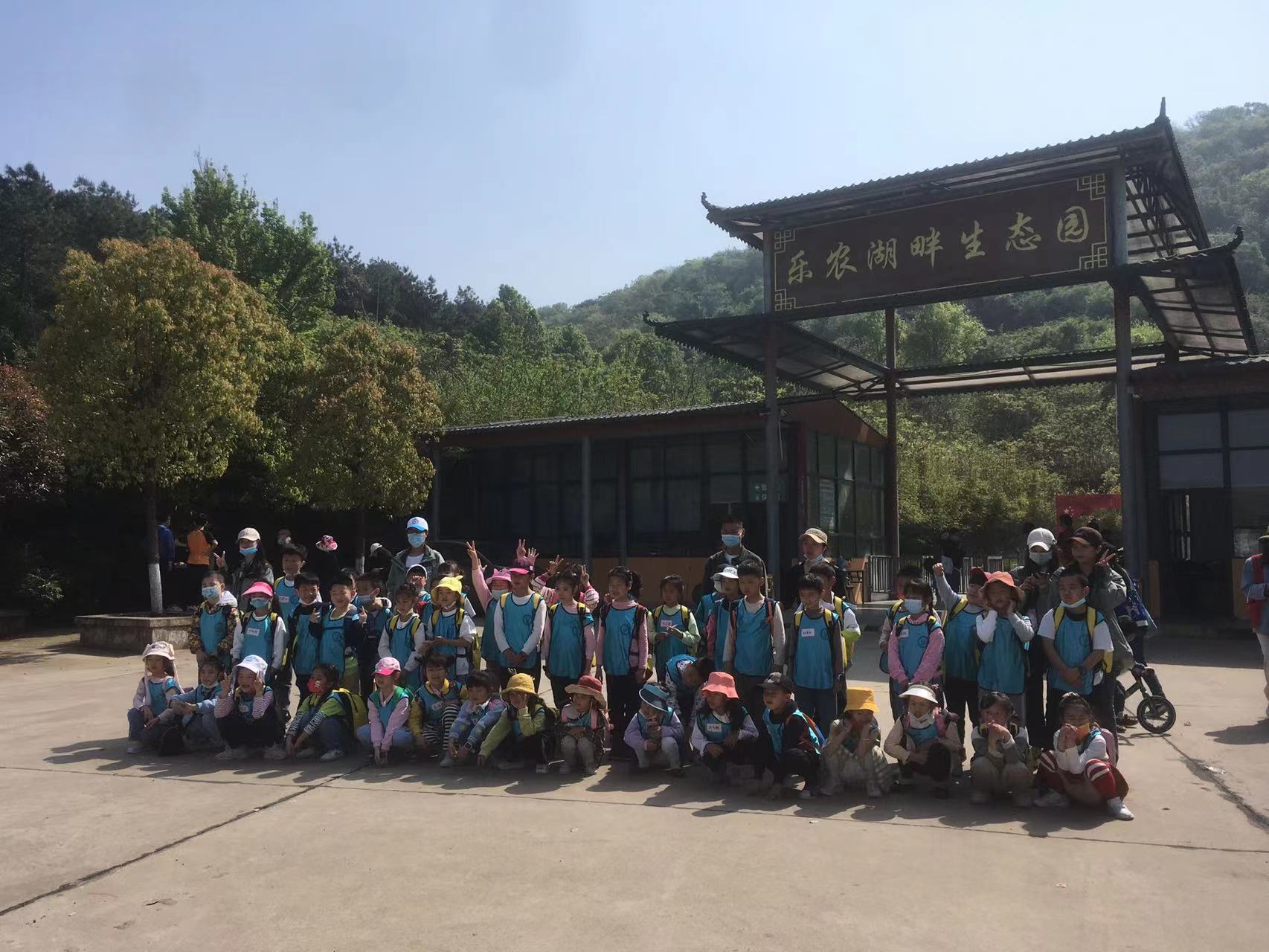 抵达农庄一小时的车程,在亲子教练的带领下,大家来到景区大门口,拉着横幅,面向摄影师大家和这里融为一体。